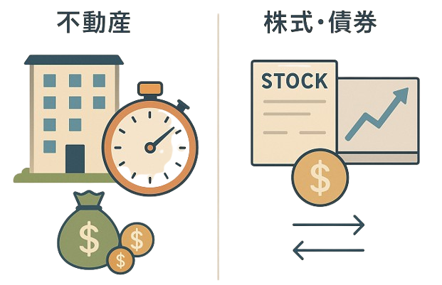 不動産は流動性と取引コストの面で株式・債券と大きく異なります。売買には時間がかかり、仲介手数料・登記費用・税コストが大きくなるため、すぐに売却・回収する戦略は非現実的です。回収期間は着実な運用を前提に設計する必要があります。